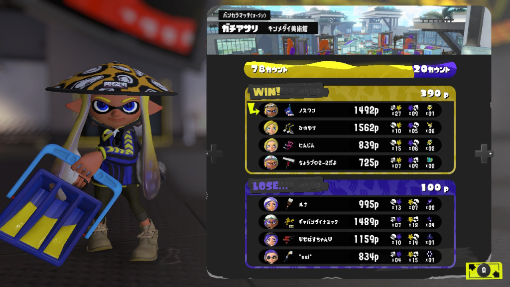 しかも下の画像みたいに塗りptもしっかり稼げている試合が多いので、味方のために前線を塗りつつキル数も稼げてるんですよね。