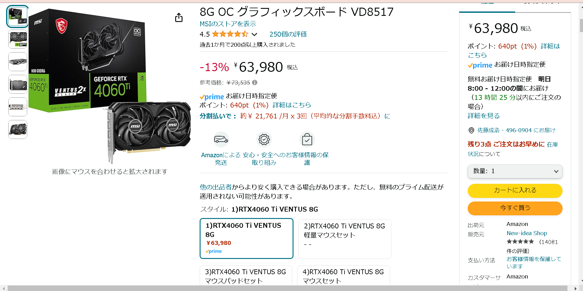 今回購入したのはMSI GeForce RTX 4060 Ti VENTUS 2X BLACK 8G OC グラフィックスボード VD8517です。