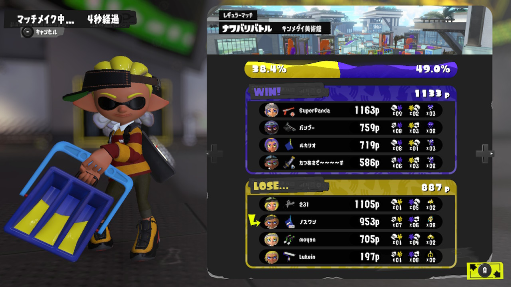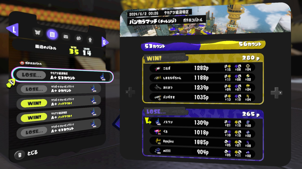 ナワバリバトルは色々と試す場所、APEXでいったらトリオ(カジュアル)になると思っているので、新武器で結果がでなくても大丈夫です