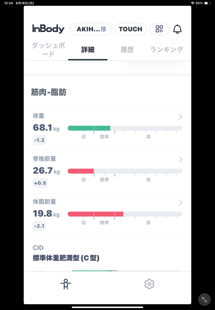 体重は-1.2kgの68.1kgでした!!体脂肪量は-2.1kgなので、体脂肪が減って筋肉量が増えているのでいい兆候ですね。
