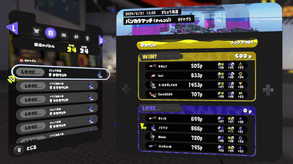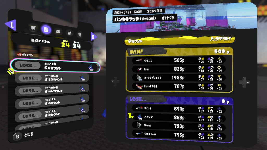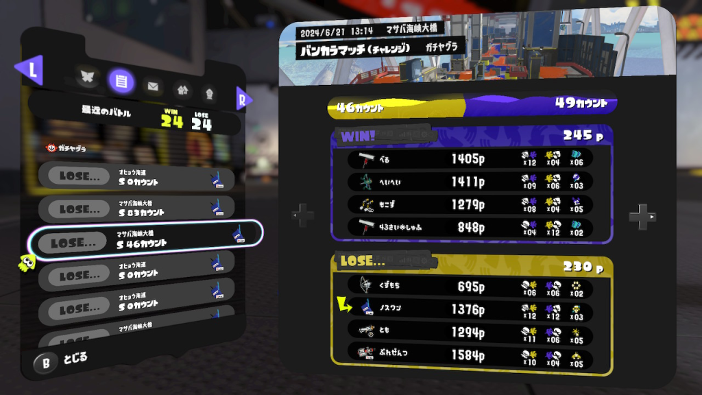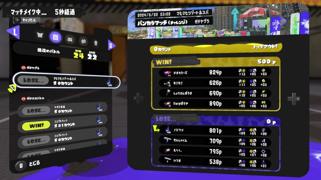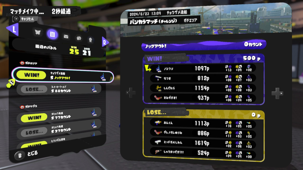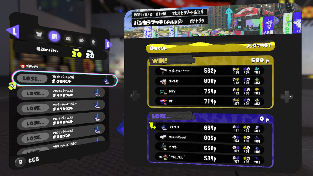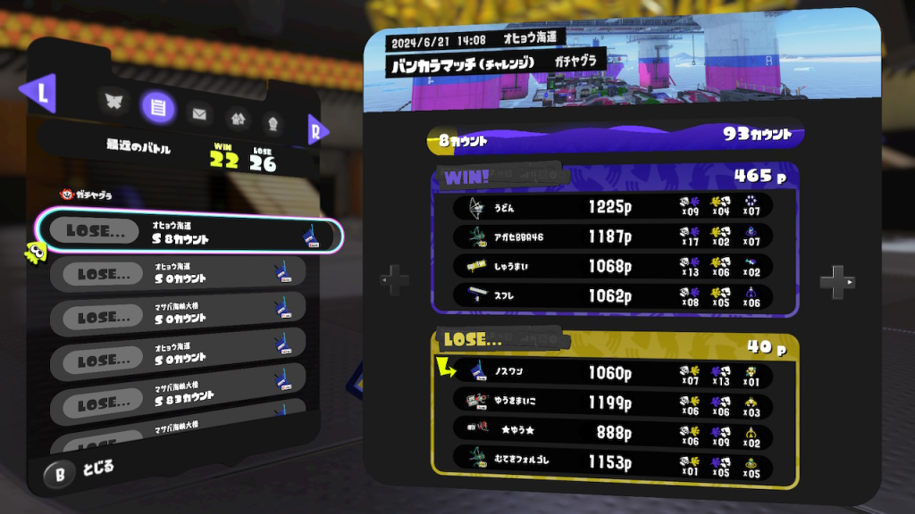 しかしながらPT集め序盤は大苦戦。なんとガチヤグラで10連敗以上(途中から数えてない)してしまい、Sランクの洗礼を浴びます。