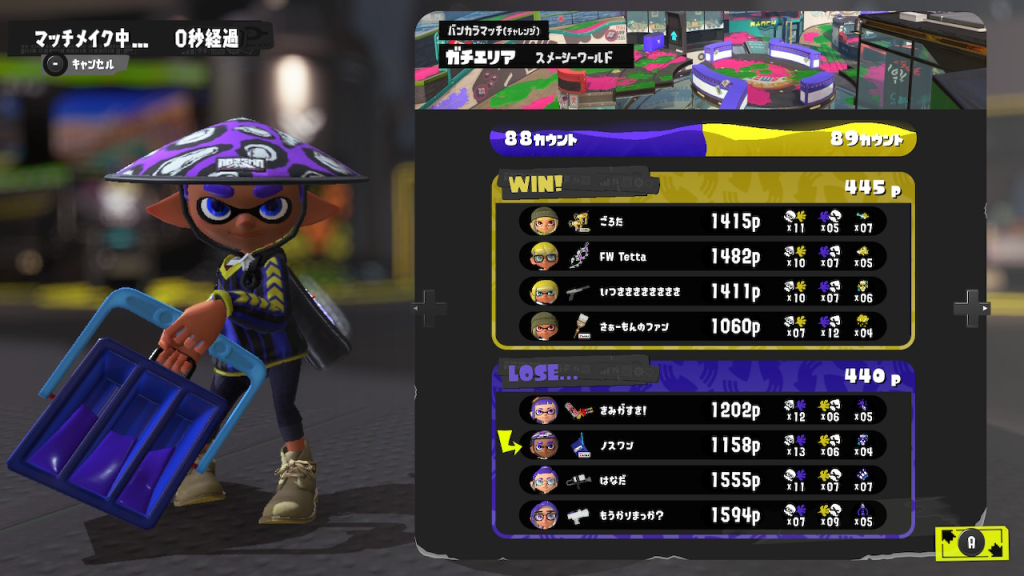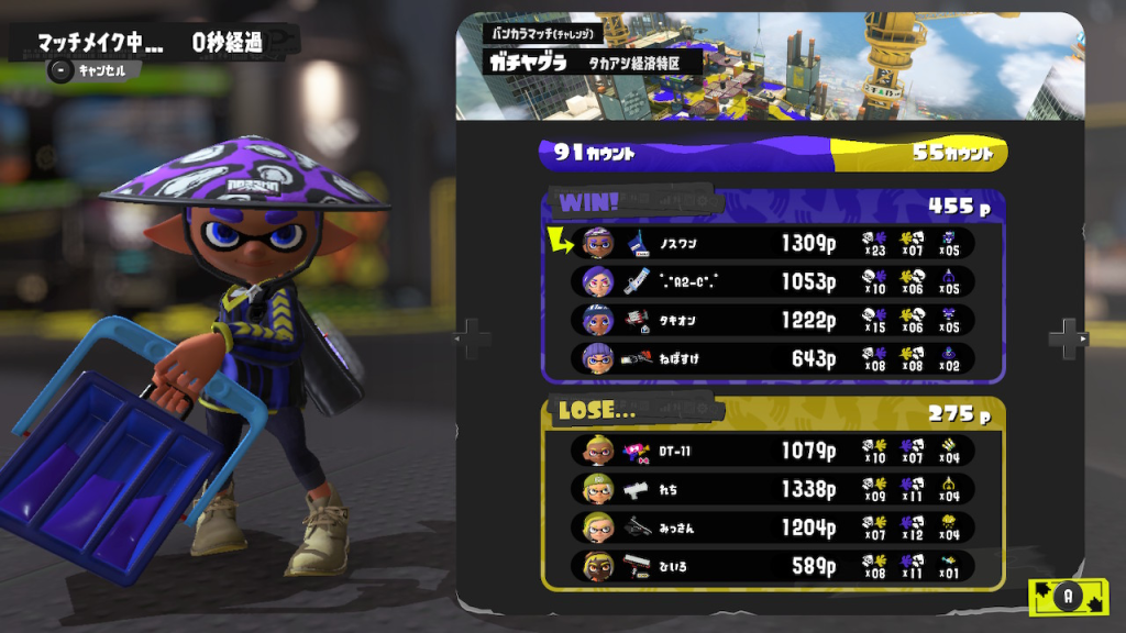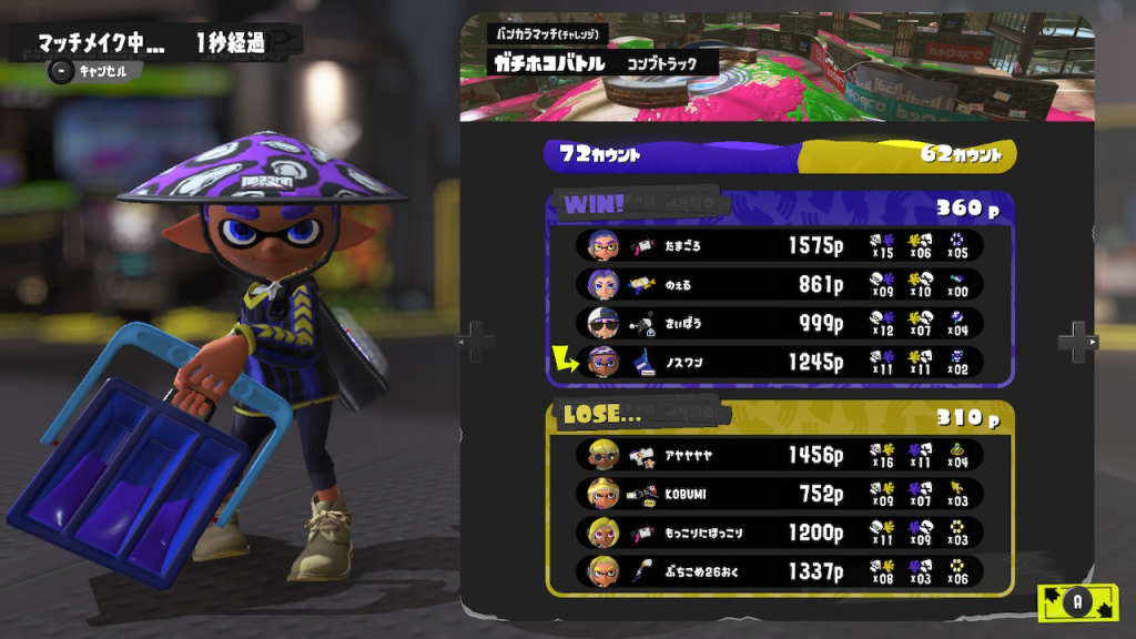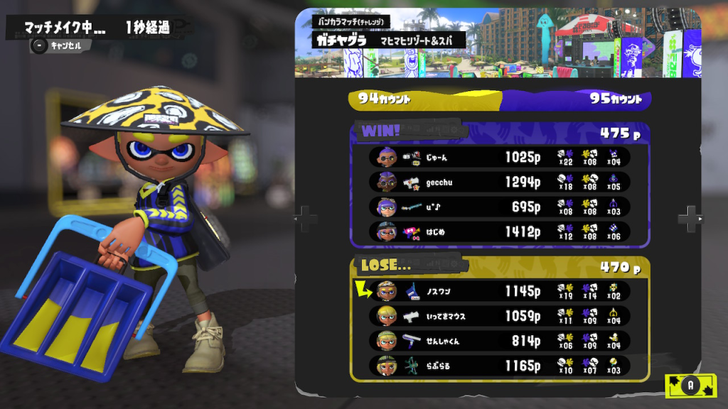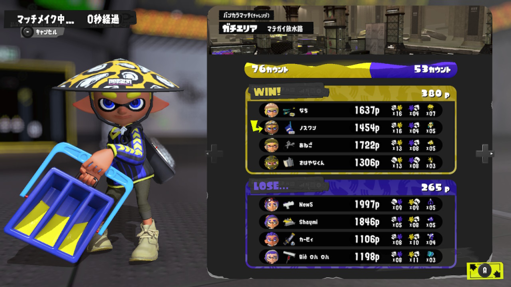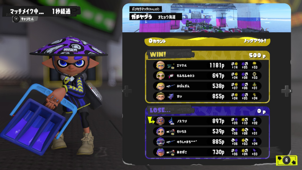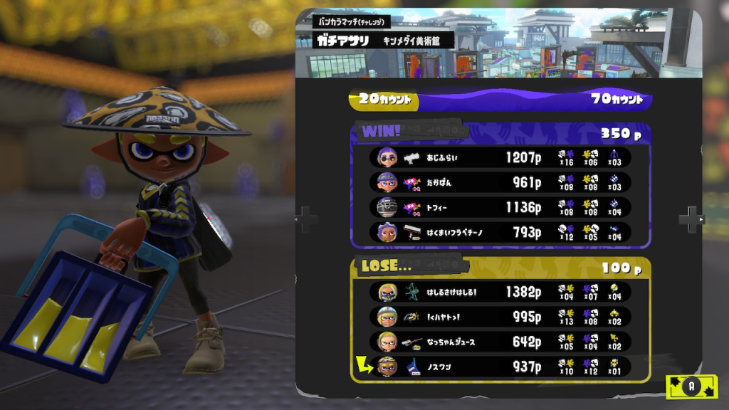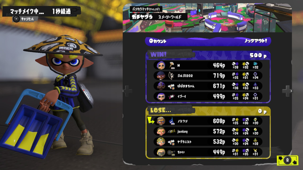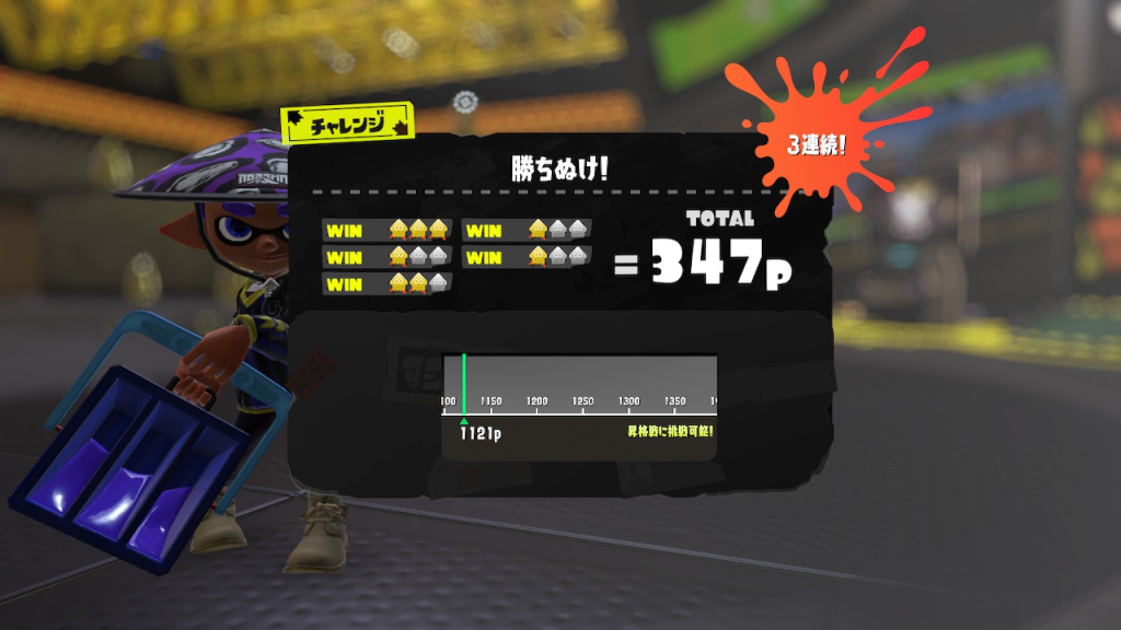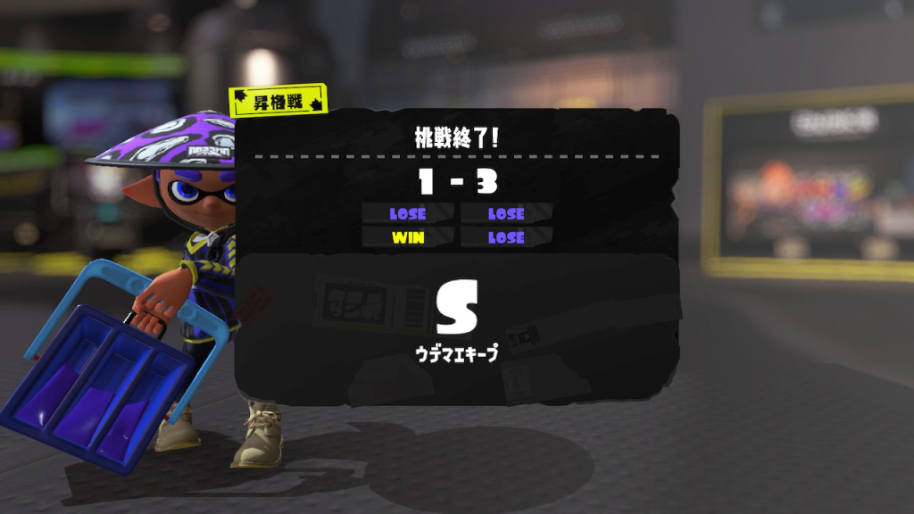 ギアを育てがてらもっとナワバリバトルで練習してきてほしい。
