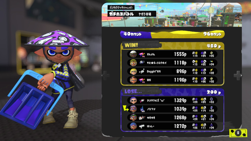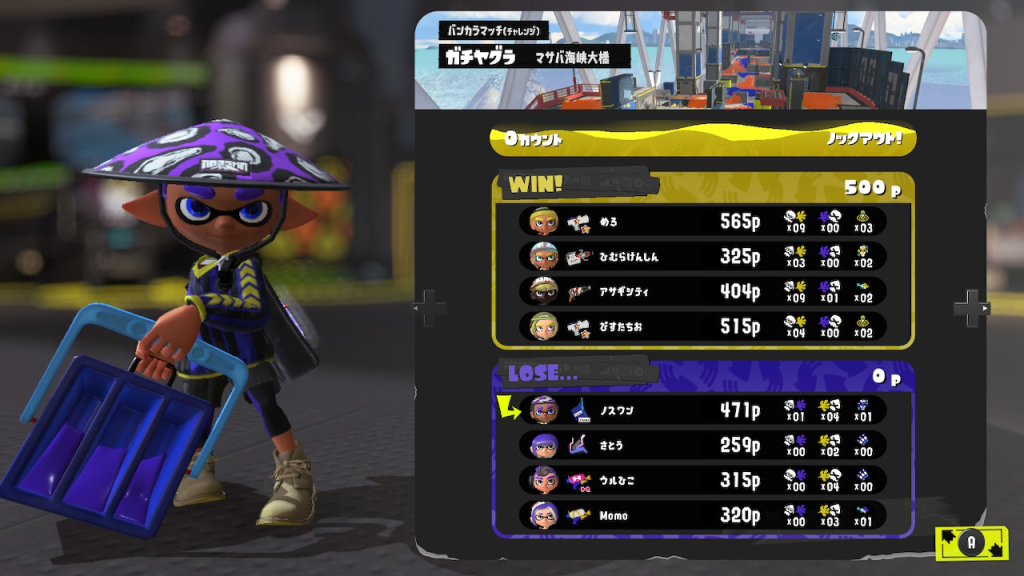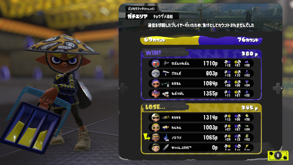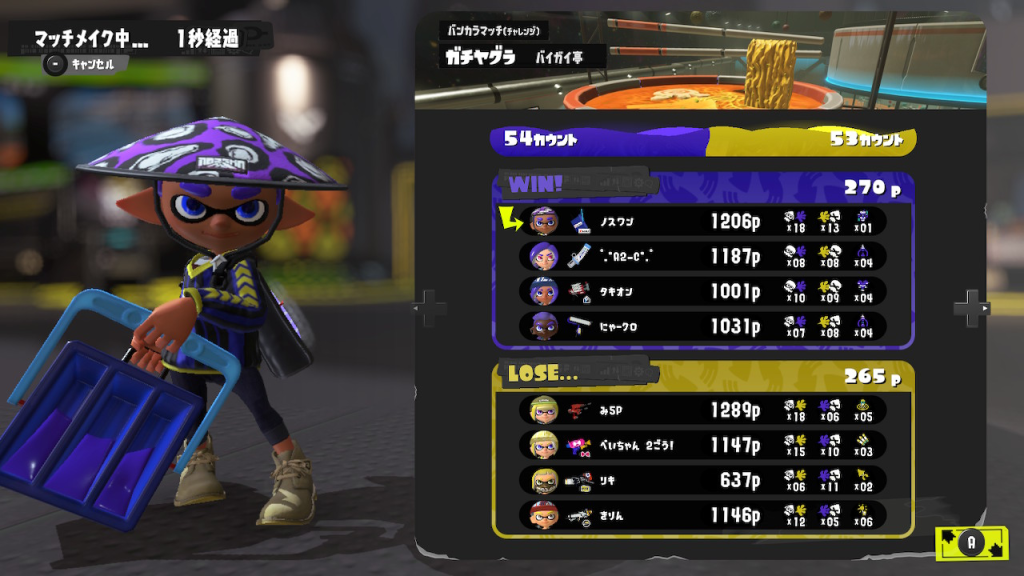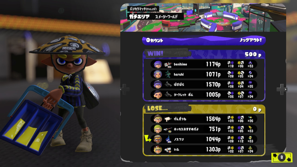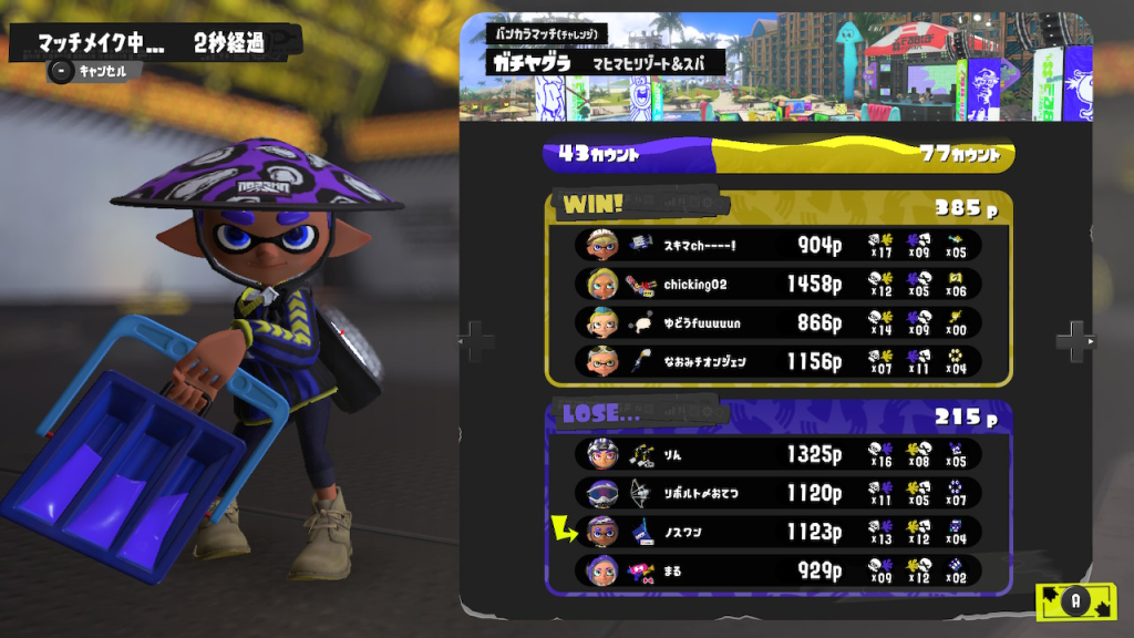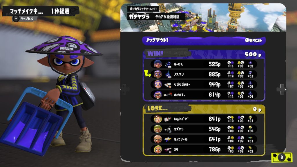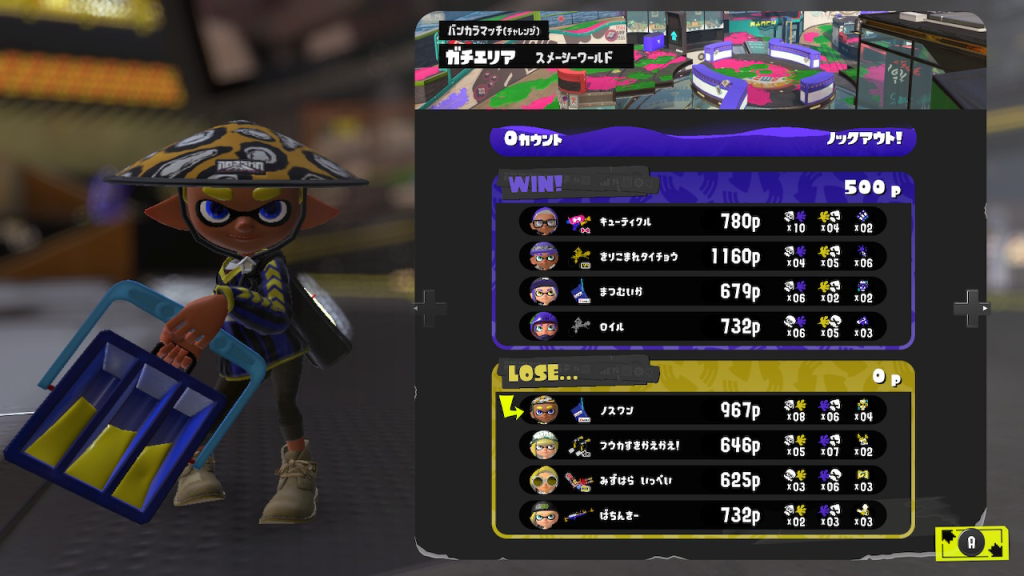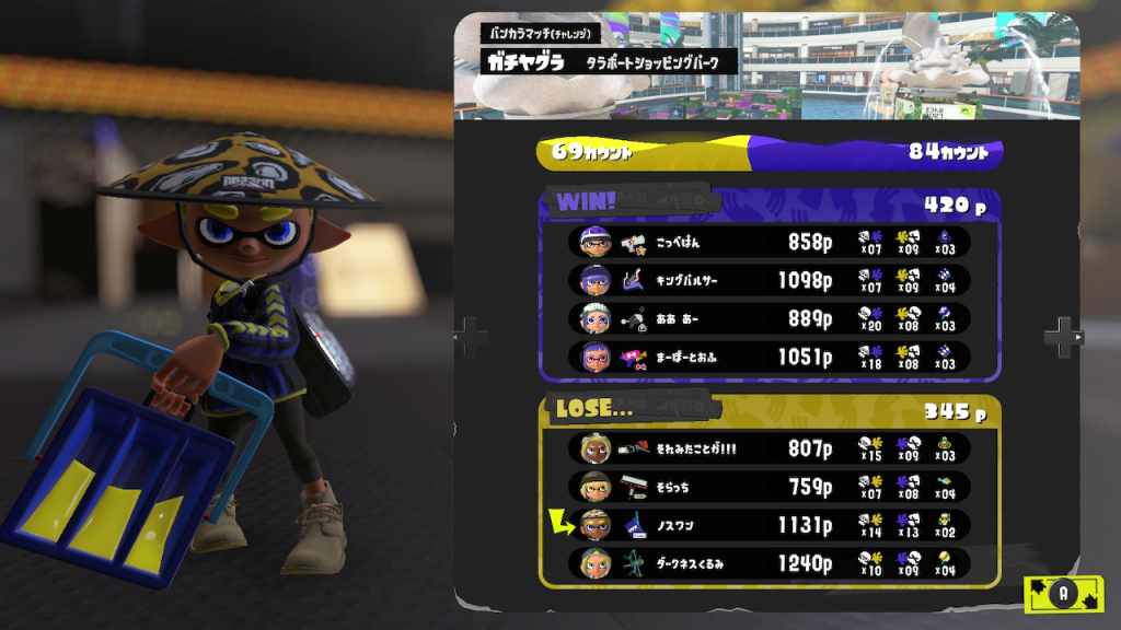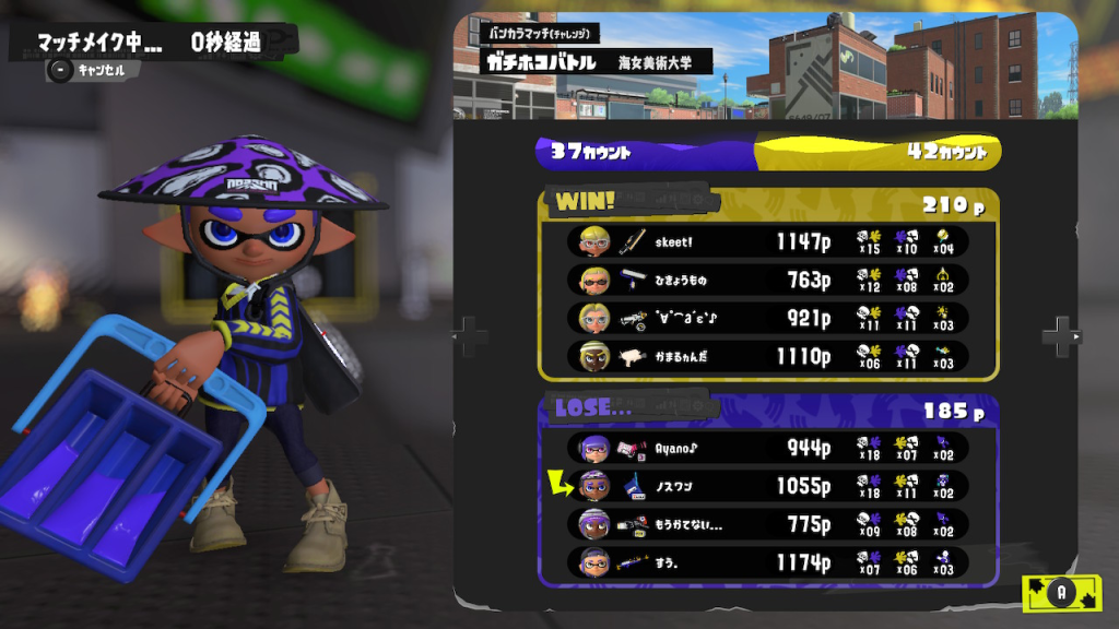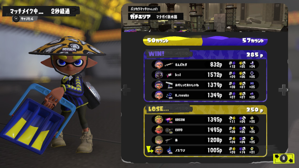 ギアを育てがてらもっとナワバリバトルで練習してきてほしい。